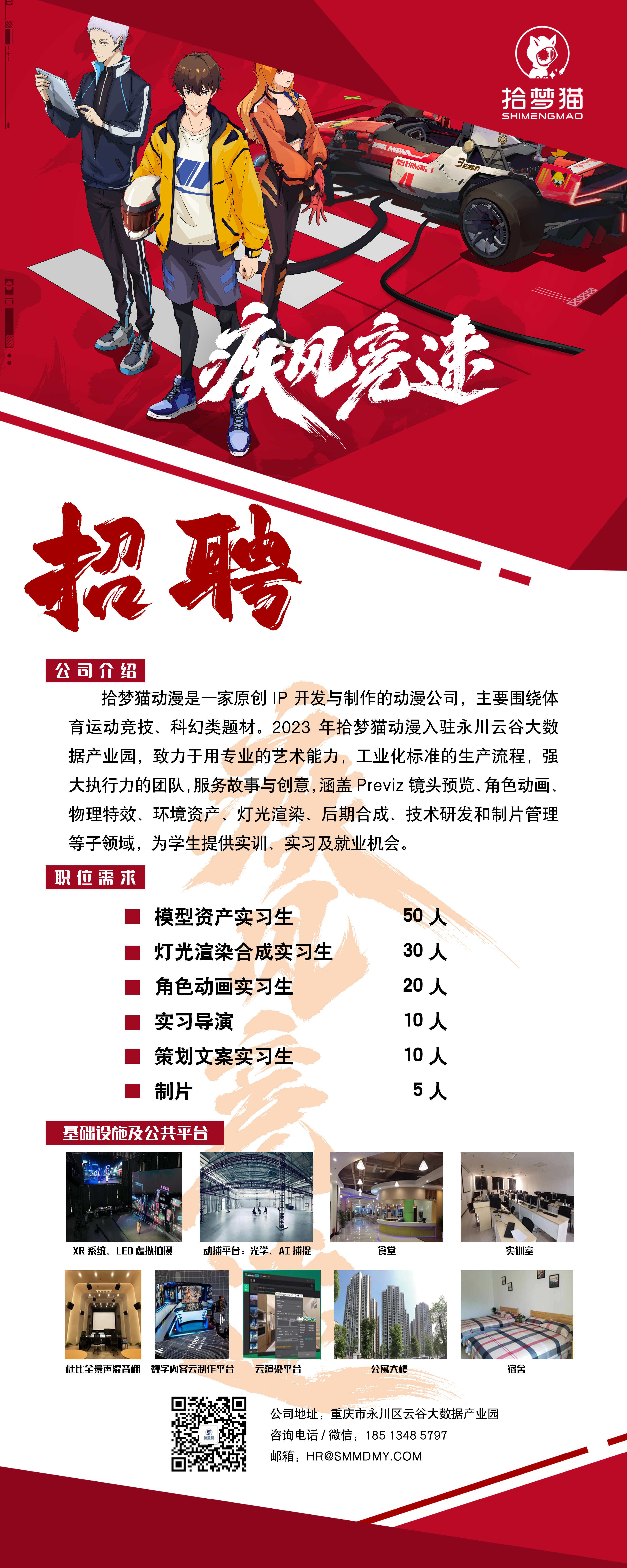 拾梦猫动漫是一家原创IP开发与制作的动漫公司,主要围绕体育运动竞技、科幻类题材。2023 年拾梦猫动漫入驻永川云谷大数据产业园,致力于用专业的艺术能力,工业化标准的生产流程,强大执行力的团队,服务故事与创意,涵盖 Previz 镜头预览、角色动画物理特效、环境资产“灯光渲染、后期合成、技术研发和制片管理等子领域,为学生提供实训、实习及就业机会。