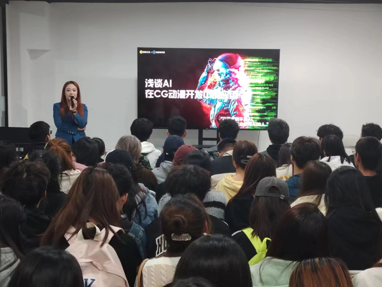 参观结束后,李沫函总经理为同学们作了专业讲座,通过介绍企业打造的天幕影院、4D影院、AI场景等优秀案例,介绍了AI人工智能技术和AI绘画,及AI在学习和工作中的重要性。