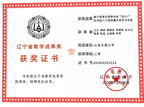 近年来专业获批国家级省级虚拟仿真实验教学中心5项、省级教学成果奖7项、省级一流课程共2门,主持省级教学改革项目10项、辽宁省精品资源共享课1门、发表高水平期刊论文43篇,出版教材20部(均为全国百佳出版单位),其中2部为全国“十三五”高等院校艺术设计类规划教材。获得辽宁省科技进步奖1项、大连市科技进步奖1项、各级各类行业奖项数十项。轨道交通视像创意设计数目年均1000分钟。