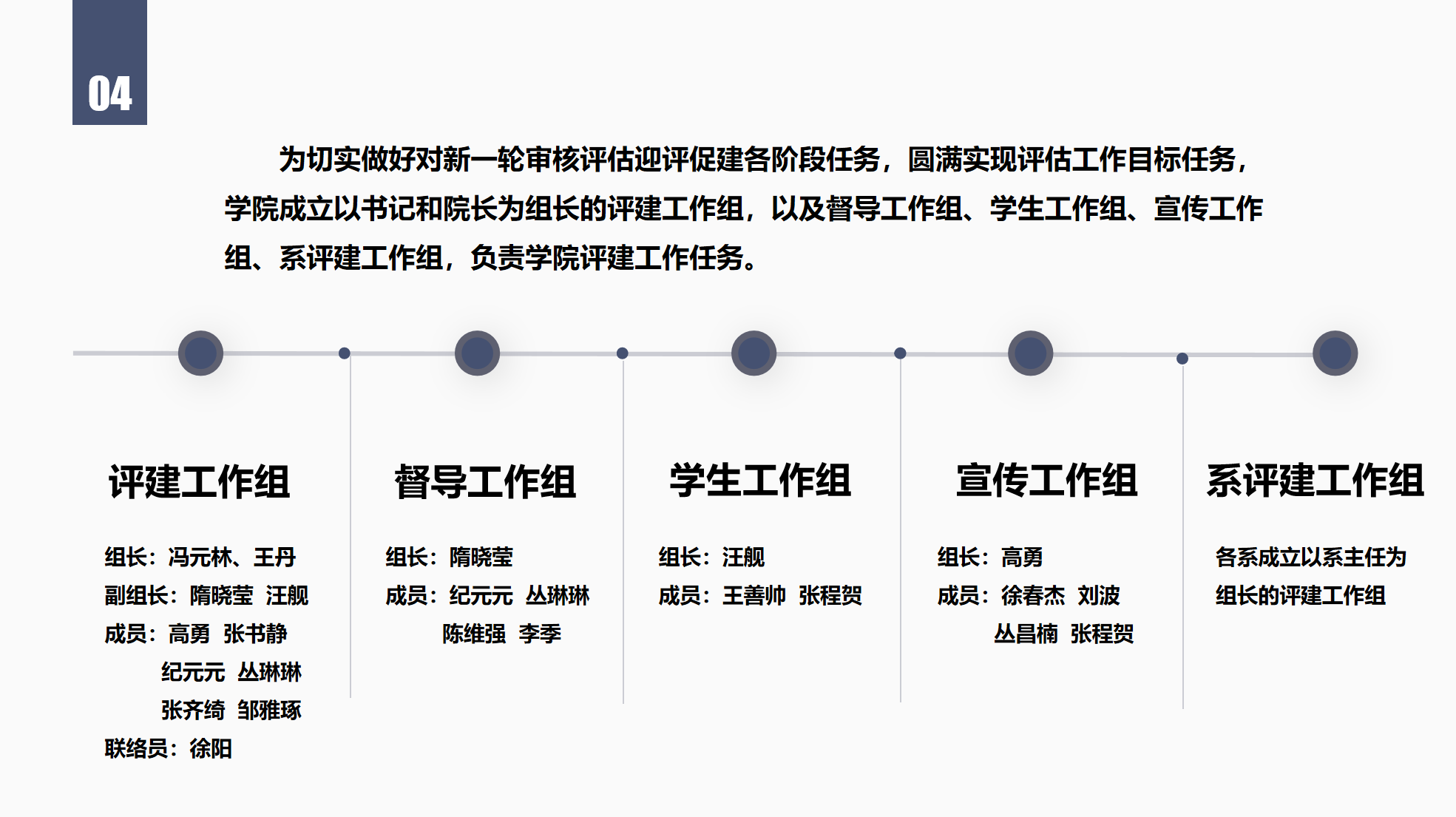 高度重视,为切实做好对新一轮审核评估迎评促建各阶段任务,圆满实现评估工作目标任务,学院分别成立以书记和院长为组长的评建工作组、督导工作组、学生工作组、宣传工作组、系评建工作组,全面统筹协调、推进落实学校的评建工作。2023年10月以来,学院先后多次召开动员会、推进会,全面部署学校本科教育教学审核评估相关工作。为迎接即将到来的线上线下考察工作,学院多措并举,动员师生了解、配合并主动参与到审核评估准备工作中,以昂扬的姿态、积极的面貌迎接审核评估工作的到来。
